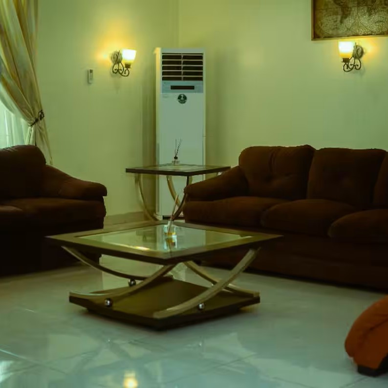 ๐Ÿ‘‰ Living Room: The living room an American designed with space kitchen next to it. It is well equipped with a smart TV, Compact Plus DSTV subscription, 2 units of 2 H Air Conditioner, Netflix, Internet service, Spacious Living Space for celebrations, Visitors Toilet, Dinning Table and Professional workspace.
