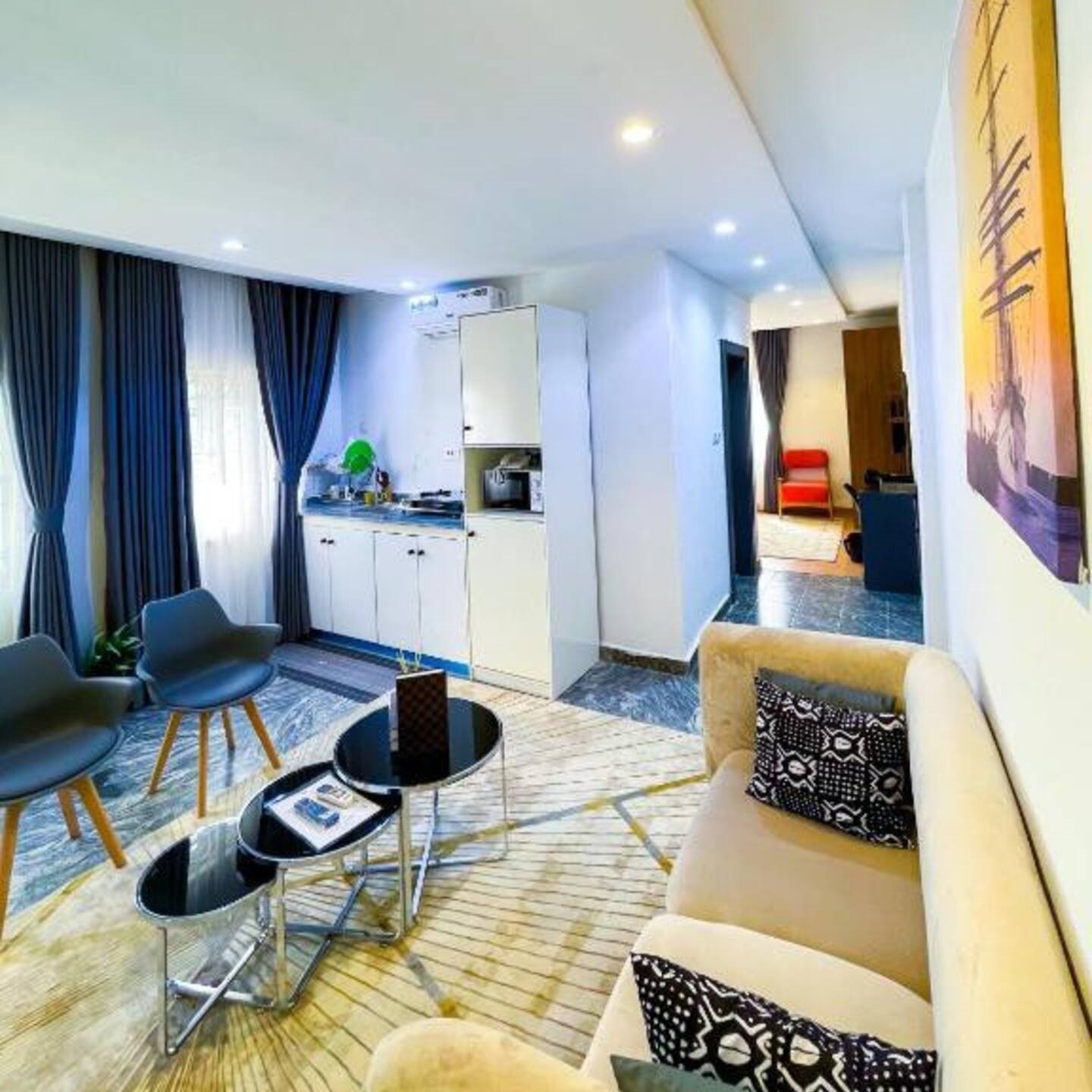 “Welcome to your luxurious sanctuary! This 1-bedroom deluxe apartment offers an open-plan layout blending dining and kitchen areas seamlessly. Relax in the charming living room, pamper guests with a convenient visitor’s toilet, and unwind in the elegantly appointed bedroom. With every corner meticulously air-conditioned, your comfort is assured. Perfectly situated for exploring the city, yet nestled in a serene haven, this retreat promises a delightful escape for discerning travelers.”