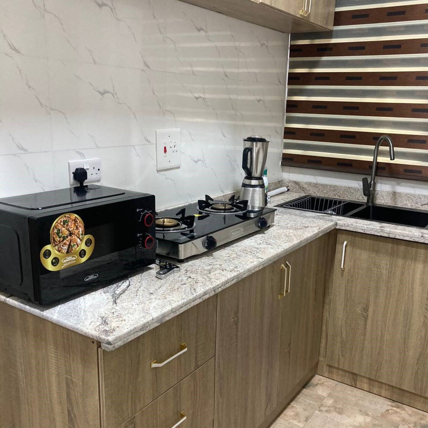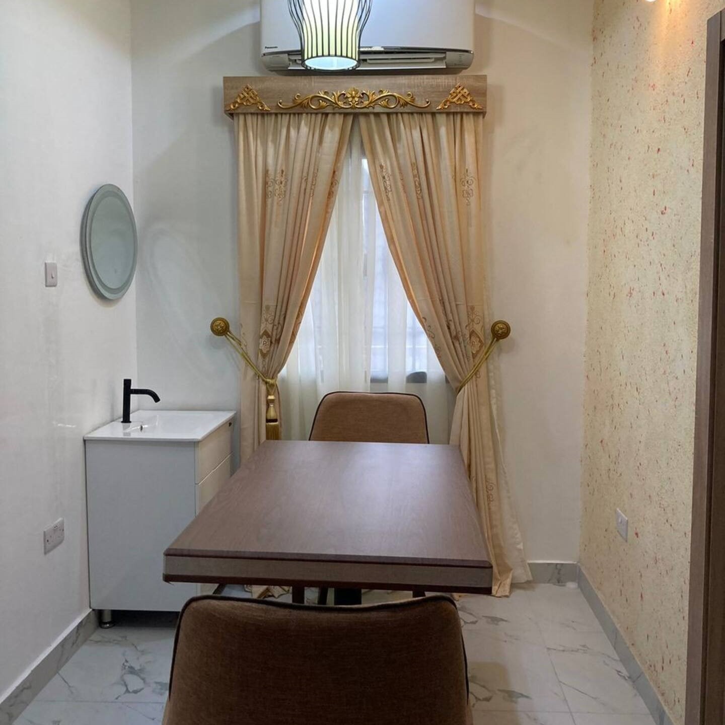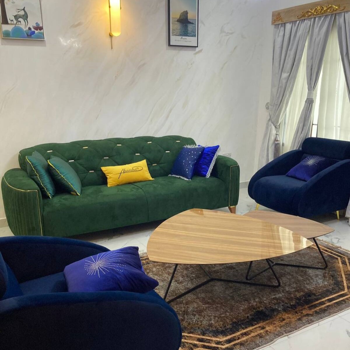 Apartment has a well furnished sitting room with beautiful sofas, 3 sitters dinning table, A portable refrigerator by the dinning and very beautiful TV consor. Well furnished bedrooms with Tvs, beautiful curtains and very clean bathrooms with water heaters. There are two bakonies both in the passage and kitchen.